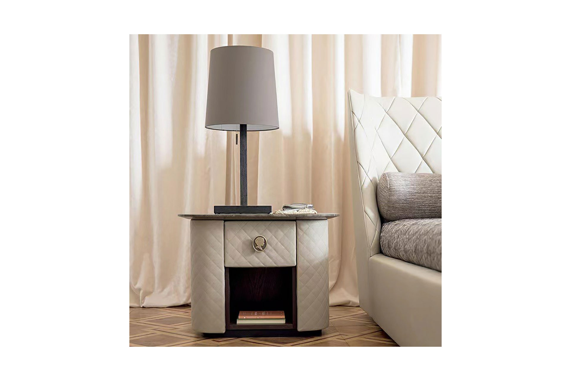 材质: 无指纹拉丝浅金+大理石台面白金沙+亚光皮车菱形格+木饰面+拉手