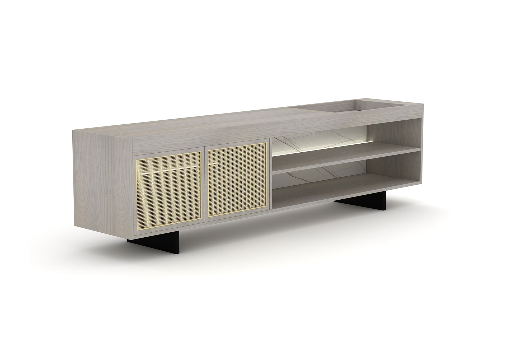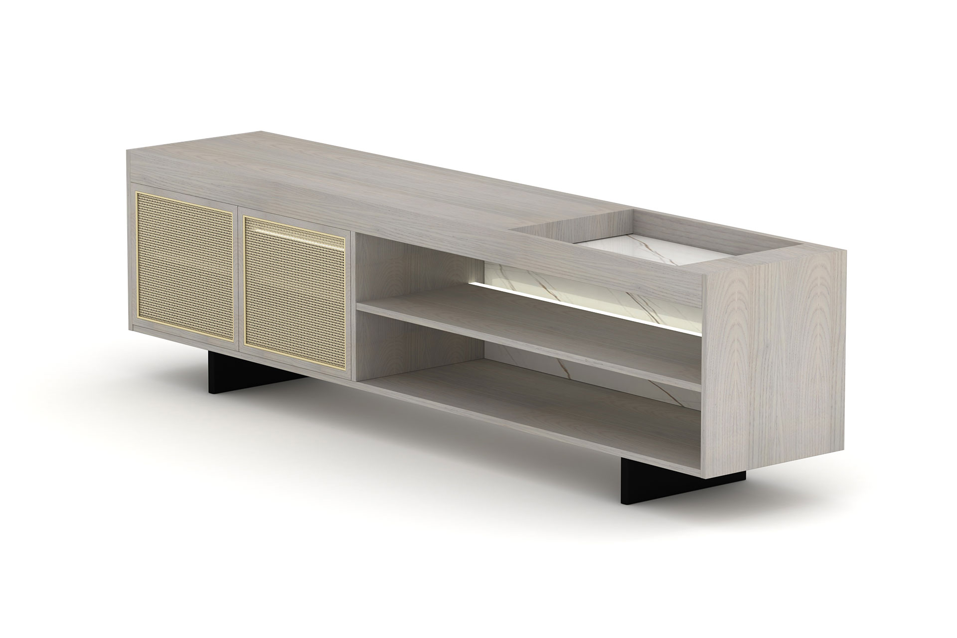 白蜡木+贴皮夹板+钢+灯组+劳伦白金岩板+四角藤编